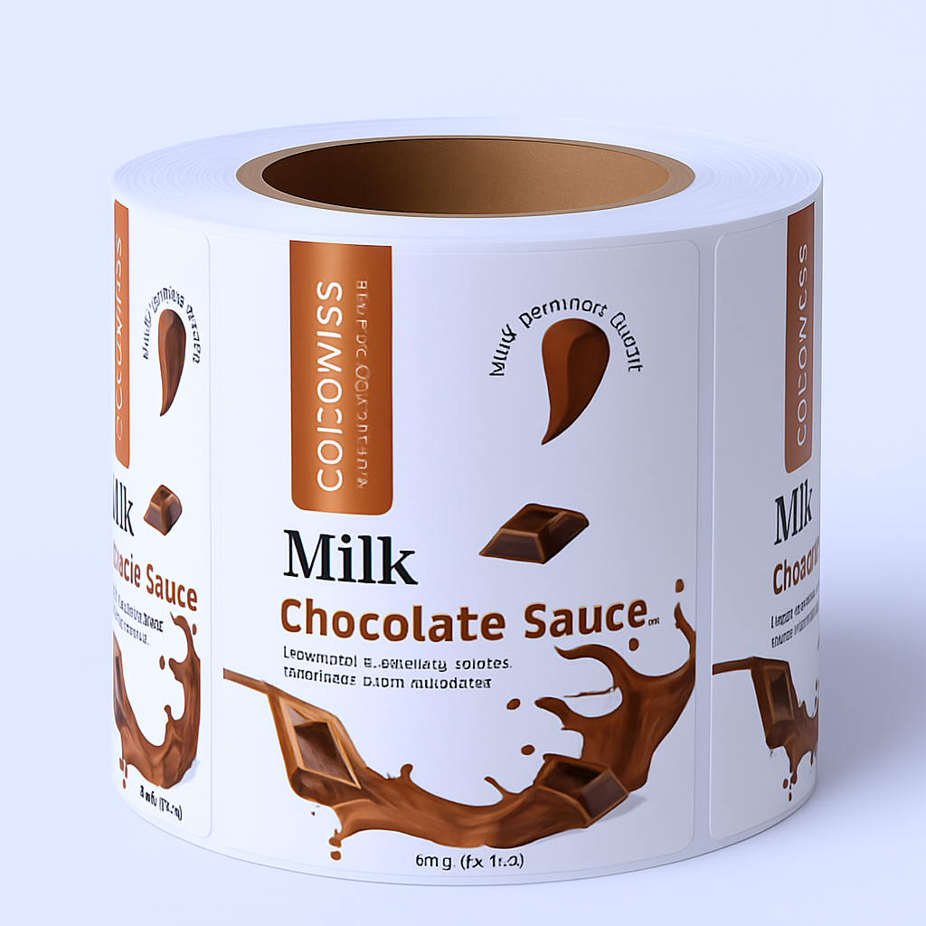 Cam kavanoz, plastik şişe veya sıkmalı ambalajlar için özel tasarlanmış çikolata sosu etiketleri.