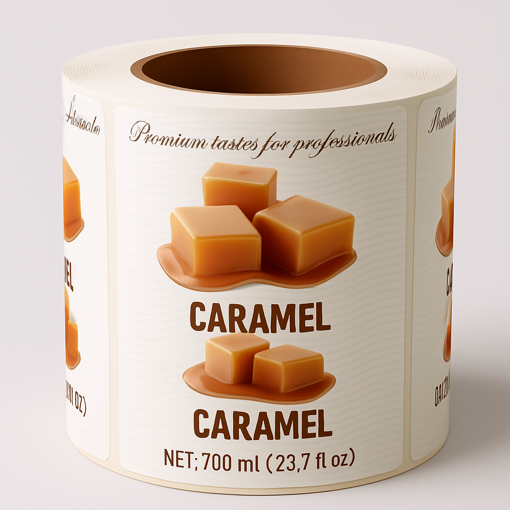 Vanilya, karamelli, fındıklı veya özel aromalı kahve şurupları için tasarlanmış şık ve işlevsel etiket çözümleri.